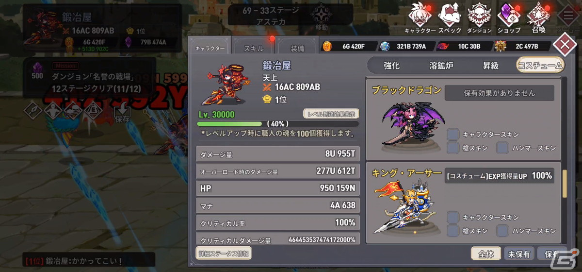 コスチュームを獲得し揃えることで、そのキャラクターの効率的な放置狩りが可能になります。